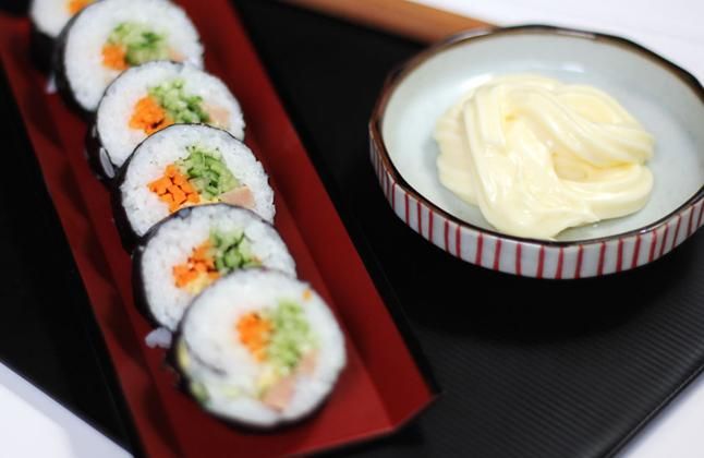 Các bạn có thể dùng sốt mayonaise hoặc tương ớt để chấm cho món kimbap thêm đậm đà và ngon miệng hơn