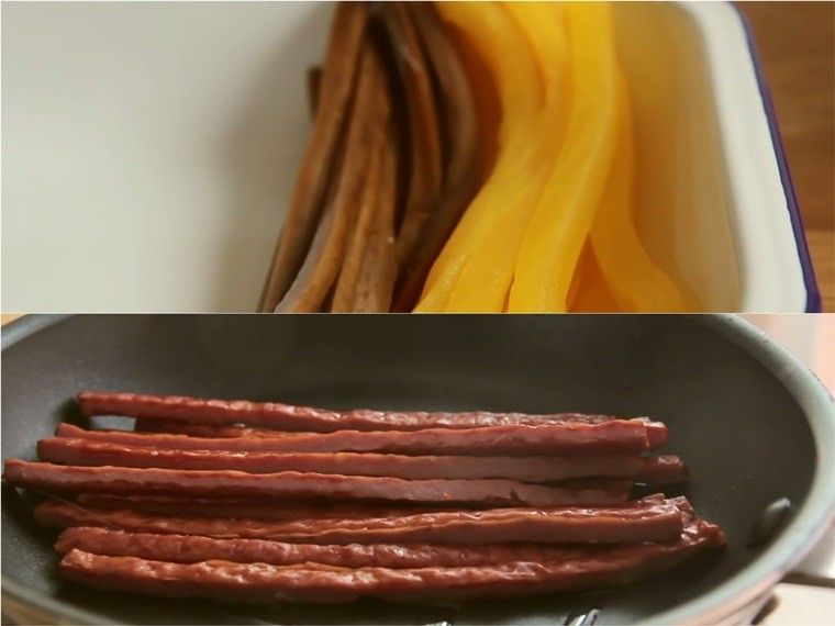 Hướng dẫn sử dụng: Thịt hem cắt sợi dùng để làm nguyên liệu cho món Kimbap