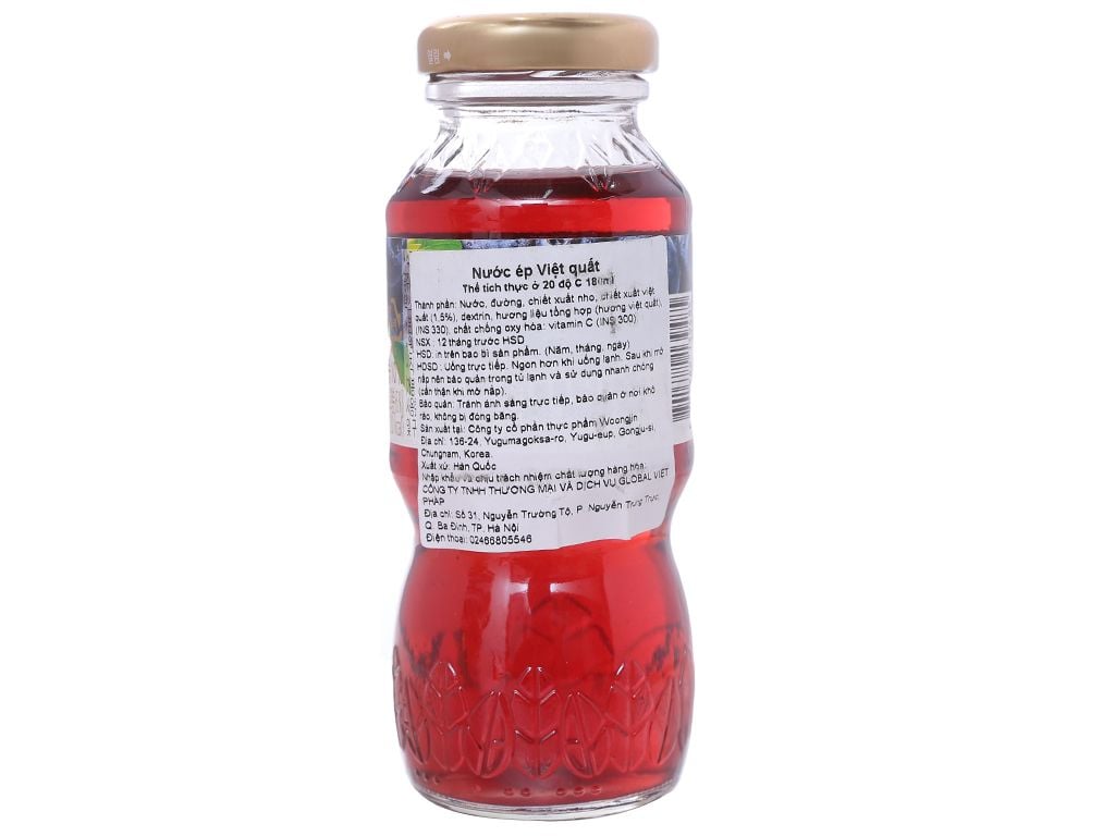 Nước ép việt quất WoongJin sản xuất từ trái cây nguyên chất, được chọn lọc nghiêm ngặt, không phẩm màu, không chứa chất bảo quản, đạt tiêu chuẩn an toàn vệ sinh thực phẩm. Hương vị thơm ngon mang đến cho người tiêu dùng cảm giác thoải mái khi thưởng thức.